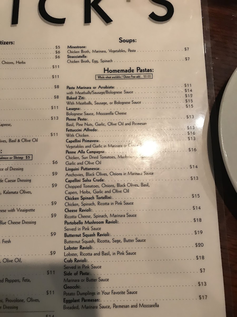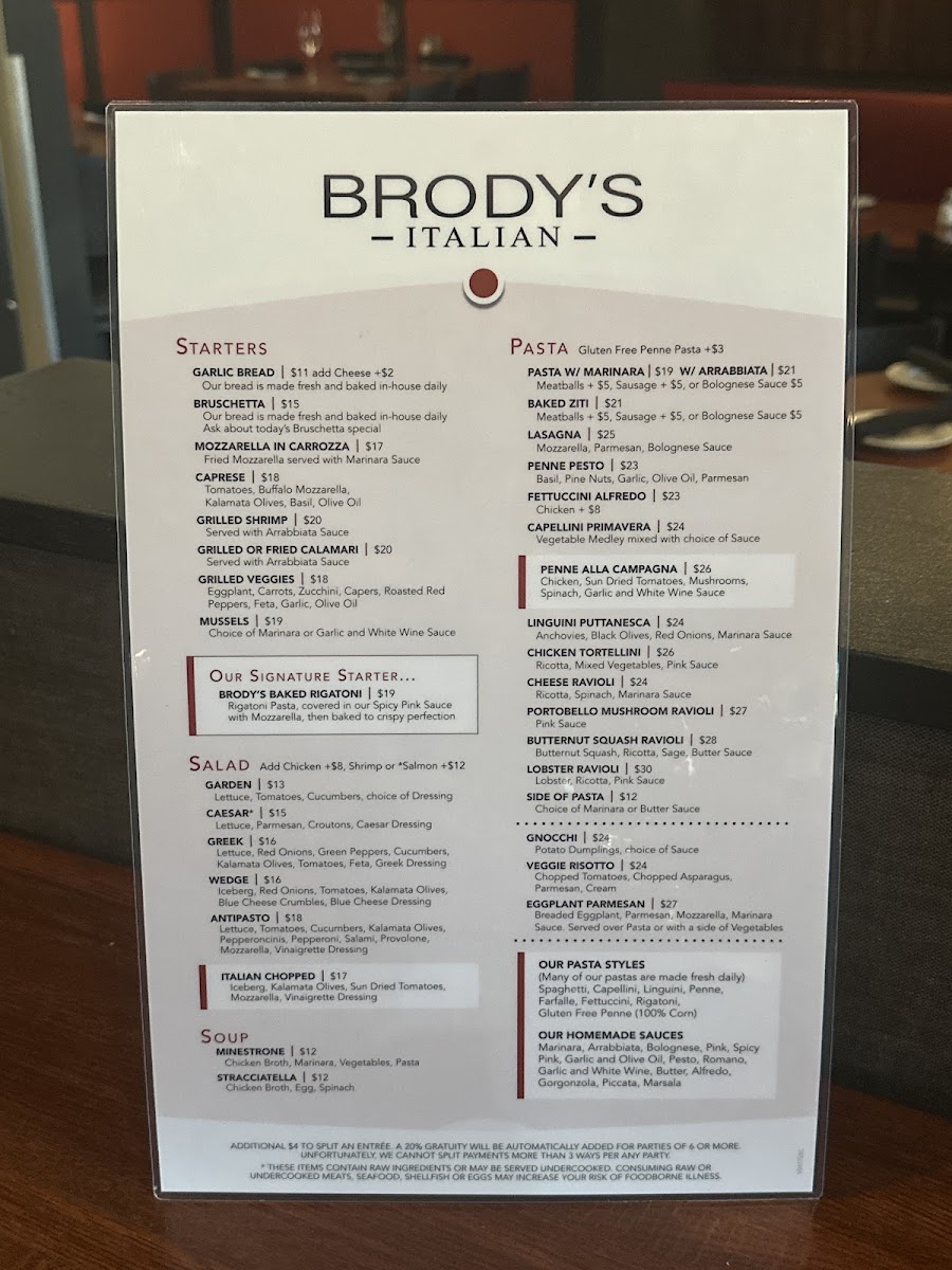 Choice of pasta: spaghetti, linguini, angel hair, penne, bowtie, fettuccini, or gluten-free penne. Sauces include marinara, arrabiata, garlic/olive oil, butter, pink, bolognese, pesto, alfredo, gorgonzola.
