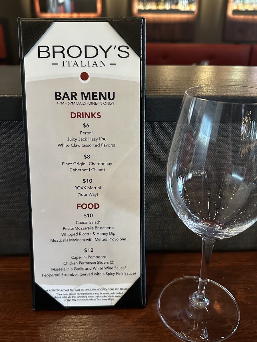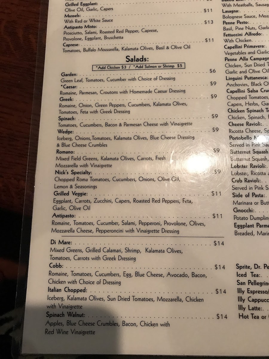 Choice of garden, Caesar, Greek, or wedge salad; eggplant Parmesan, chicken Parmesan, Italian combo, or salmon pesto sandwich; plus soft drink.